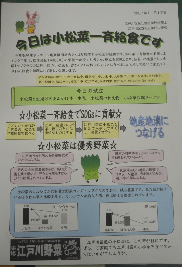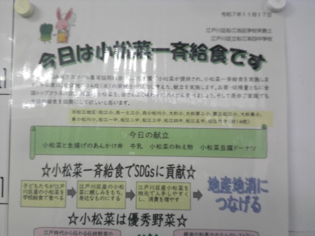 今日、11月17日は小松菜一斉給食(松江地区統一献立)です。