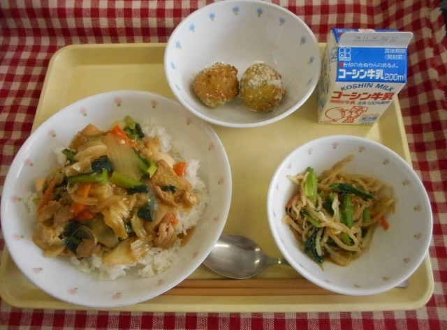 小松菜と生揚げのあんかけ丼 小松菜の和え物 小松菜豆腐ドーナツ 牛乳