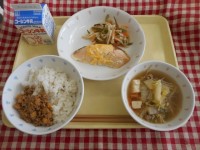 ごはん 肉みそ大豆 ますの紅葉(もみじ)焼き 大根とじゃこのおかかあえ 芋の子汁...