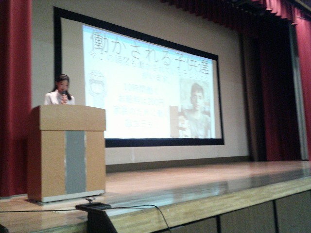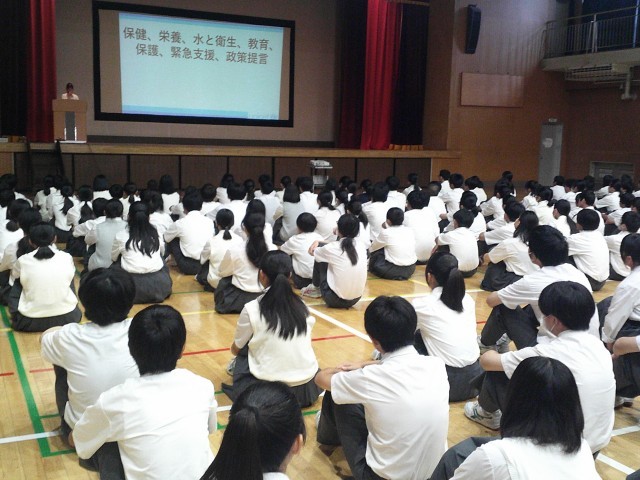 9月29日(月)生徒会朝礼。来週から始まるユニセフ募金に際し、生徒会本部役員がユニセフの活動などについて紹介するプレゼンテーションを行いました。よくまとまっていて、わかりやすかったです。