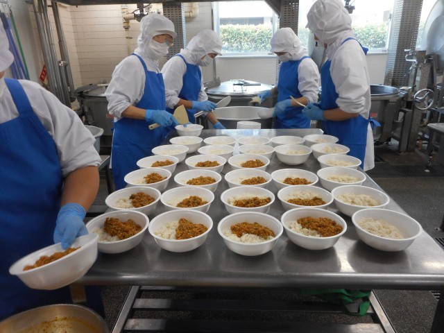 調理師さんは朝早くから準備し、給食を作り、丼ぶりにつめてと大忙しでした。