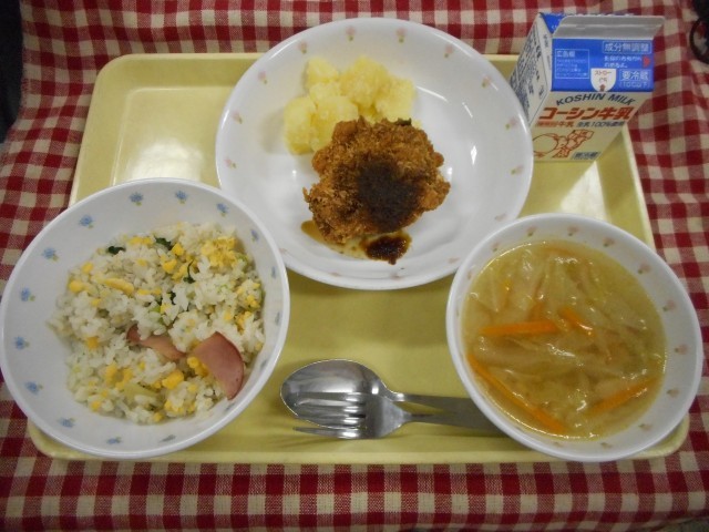小松菜ピラフ さばのガーリックフライ コンソメスープ アーモンド粉ふき芋 牛乳