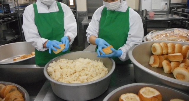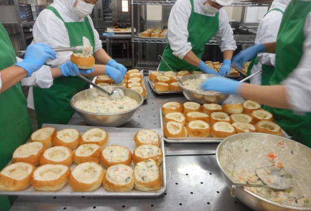 グラタンパンはパンの中味をくりぬき、グラタンを詰めて焼きます。