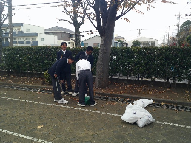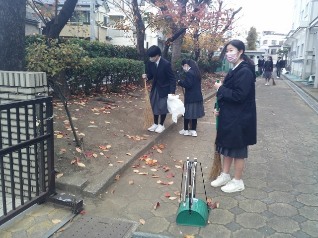本日の落ち葉掃きの担当は3年3組です。楽しい雰囲気のなか清掃活動を行っていました。