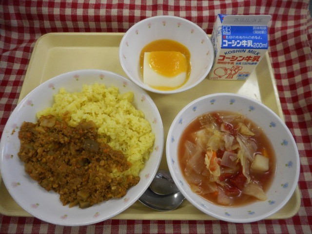 根菜のドライカレー 大豆入りミネストローネ 豆乳寒天ピーチソース