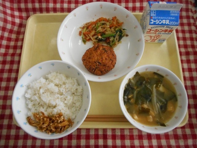 ごはん ナッツごぼう 豆腐のまさご揚げ おひたし じゃが芋と玉ねぎのみそ汁 牛乳