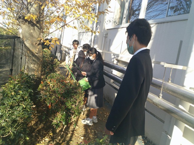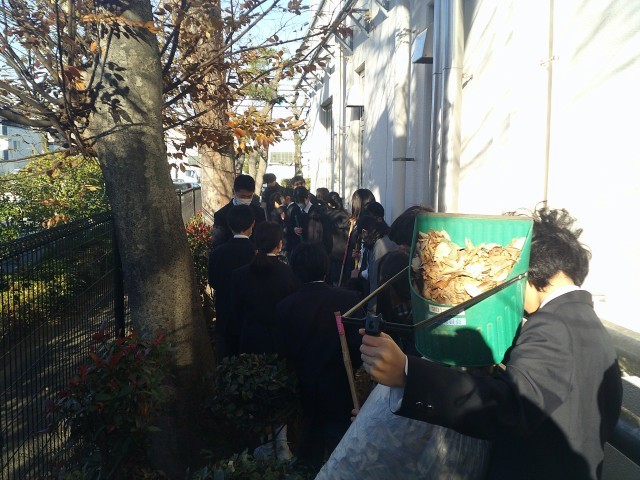 本日の落ち葉掃きの担当は1年1組です。体育館の裏側を中心に清掃していました。