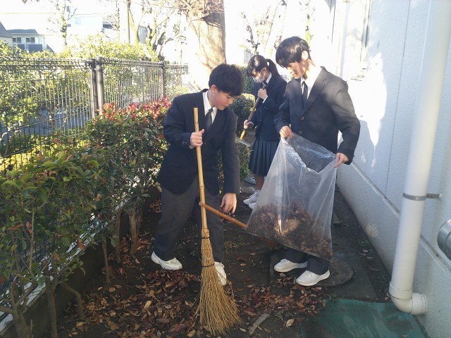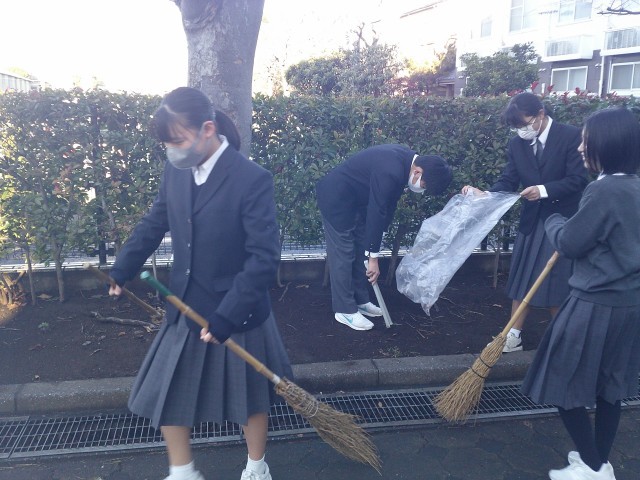 本日の落ち葉掃きの担当は1年2組です。先週後半と比べ、やや暖かく、活動しやすい朝でした。