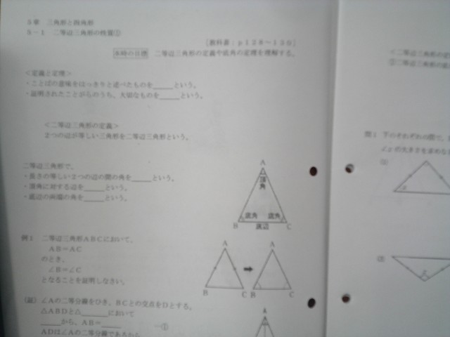 2年生の数学は少人数形式で行われています。二等辺三角形の性質について学習していました。