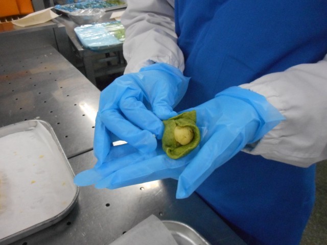 給食週間最終日は小松菜まんじゅうをつくりました。小麦粉、べーキングパウダー、さとうなどの材料と、小松菜を乾燥させて粉にした小松菜粉を混ぜてまんじゅうの生地を作りました。