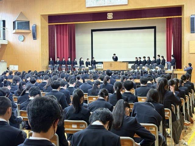 本日は任命式と生徒総会が行われました。任命式では専門委員の生徒らを代表して、各専門委員長に向けて任命証を授与しました。生徒総会では議案書討議で出た意見や質問に対して、委員長より答弁を行う形で実施しました。
