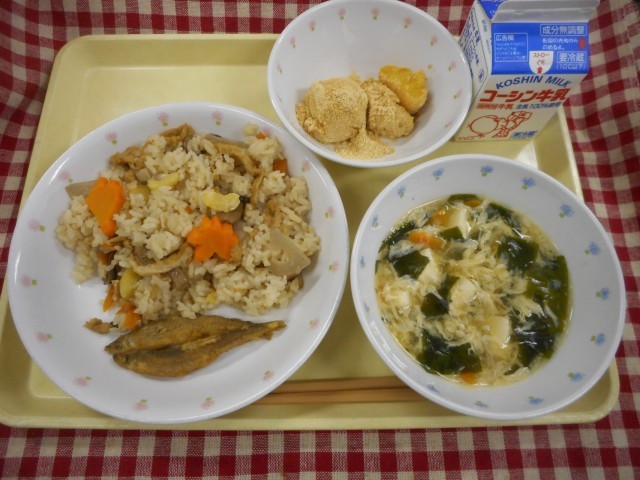 吹き寄せごはん わかさぎの揚げ漬け、かきたま汁 お月見のかぼちゃ白玉 牛乳