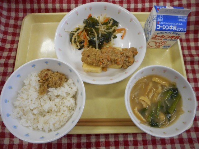 ごはん 手作りなめたけ 揚げ豆腐の肉みそかけ わかめとハムの和え物 大根のみそ汁...