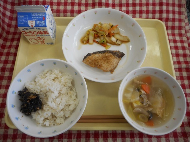 ごはん のりとあさりの佃煮 ぶりのつけ焼き 白菜と昆布の即席漬け ちゃんこ風スー...