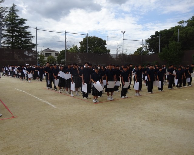 今年は、松江第五中学校開校65周年の年、60周年がコロナ禍で十分なお祝いができなかったことから、その時の思いも込めてお祝いしようと企画されたものです。その特別感がある開校65周年の年に在籍する全校生徒、教職員全員での記念撮影を実行しました。