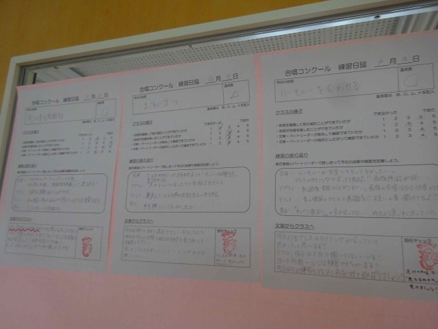 3枚目の写真は、練習後の毎回の記録です。このように各クラスが、前回の反省を共有して練習に臨んでいます。伸ばしたいテーマがはっきりしています。