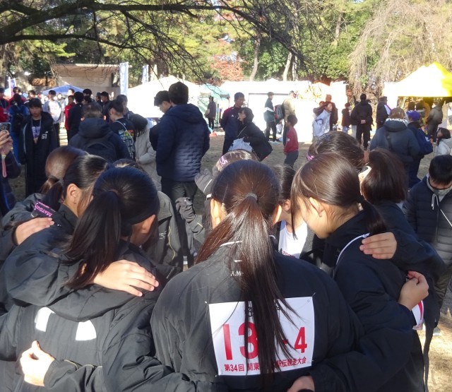 第1走者スタート地点への異動前は、チーム8名が円陣を組み、今まで頑張ってきたこと、この関東大会をみんなで乗り越えよう、応援しながらベストを尽くそうと確認し合っていました。