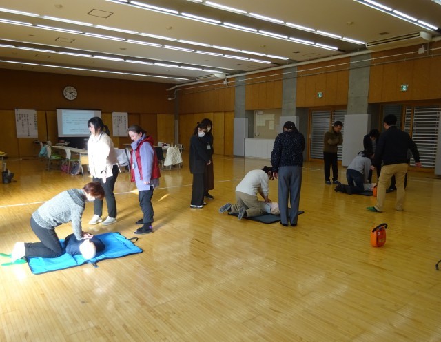 内容は、第1部:給食試食、第2部:給食運営委員会、第3部:学校保健委員会の3部構成で行いました。給食運営委員会では、食物アレルギーの対応や質問の回答、学校保健委員会では生徒保健委員会の活動紹介動画、保健室の紹介、本校の健康課題等、学校医の先生のお話を交えて会を進めていきました。そして、最後は三和商事様による救急救命、AED講習が行われました。
