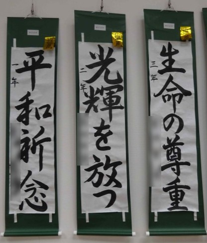 授業で制作した作品の中で選ばれた作品が並んでいます。美術、技術・家庭、書写の作品です。松江五中の作品は、どの作品も、すばらしく個性あふれる、また細部にまでこだわった、発想豊かな作品ばかりが並んでいました。書初めの作品も、練習の成果を発揮し、力強い堂々とした作品に感じました。