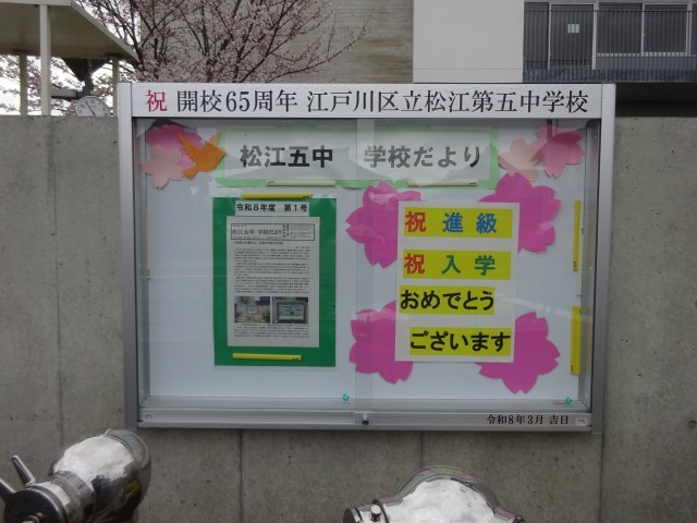 ※令和8年3月、正門に掲示板が設置されました。昨年度開校65周年を記念して区に設置していただいたものです。これから、学校だよりや委員会、部活動等、生徒の活躍をお知らせしていきます。学校の前を通りがかった際には、立ち止まって目にしていただくと幸いです。
