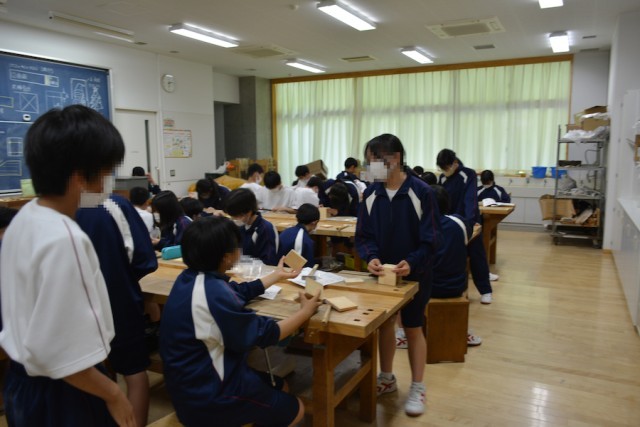 木工作業の授業でヤスリや金づちを使っての作業をしていました。