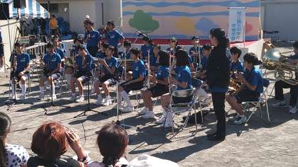 ふるさとまつり午前の部の最後を飾ったのは、本校吹奏楽部の演奏でした。MCを入れるなどおなじみの演出も交えて4曲を演奏しました。外での演奏にも慣れている本校吹奏楽部は、風が強くなることを予想して、楽譜を全部覚えて演奏しました。さすが〜!