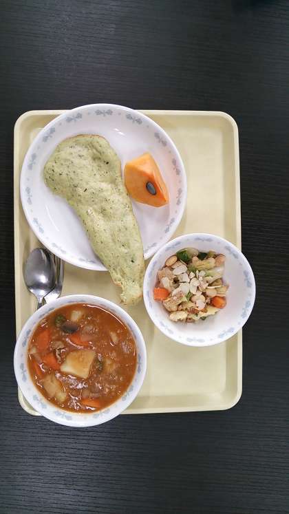 今日は、小松菜入りのナンでした。小松菜の風味によって日本風なテイストになっていました。調理の皆さんが一つ一つ手作りしたナンは、具沢山のスープとよく合っていて、とても美味しくいただきました。