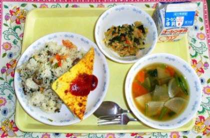 スパニッシュオムレツには、玉ねぎやじゃが芋、ピーマンなどが入っています。ふんわり美味しく焼けたので、生徒たちもよく食べていました。かぶのスープには少しとろみをつけたので冷めにくく、なめらかな食感になりました。かぶは今が美味しい時季です。給食では、旬の食材をなるべく取り入れるようにしています。