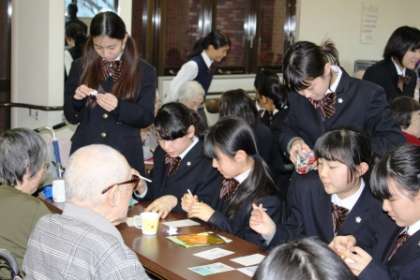 本年度第二回申孝園交流会には、40名近い生徒が参加しました。歌のプレゼントとカルタ取り、折り紙などでの交流を楽しみました。ある3年生の女子は、「(毎回参加していた交流会にう参加できるのが)もう最後だと思うといつもより心をこめて歌やおしゃべりをしました。この会がずっと続くといいな」と感想を書いていました。