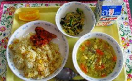 タンドリーチキンは、リクエスト給食、主菜部門で第1位でした。様々な香辛料とヨーグルトに漬け込み、味をよくなじませて焼くので、スパイシーな中にもヨーグルトのほのかにまろやかな味を感じます。サラダやスープと合わせて、野菜も具沢山でしたが、生徒たちはよく食べていました。