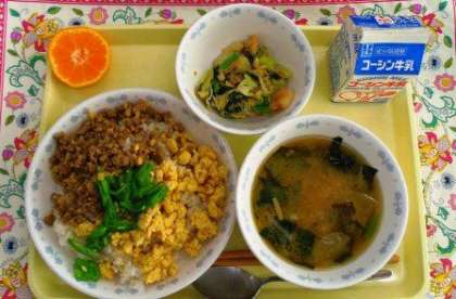 今日の給食 2月17日 公開日 2016/02/17 更新日 2016/02/17 お知らせ 三色丼 魚介のごまだれ和え じゃが芋のみそ汁 菊花みかん・牛乳 甘辛く味付けしたひき肉・いり卵・さやいんげんの三色で丼ぶりにしました。ひき肉には細かく刻んだ大豆を混ぜて、ボリュームアップです。生徒達もよく食べていました。 いいね(0)