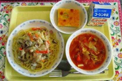 バナナには、様々な種類の糖質が含まれているので、体内への消化吸収速度が異なり、エネルギー補給が長時間持続します。そのため、スポーツを行う前に食べられることも多いようです。朝、時間がない時にも手軽に食べられるのでおすすめ。今日の給食では、細かく刻んでケーキに混ぜました。今日のスパゲティ、ケーキは、リクエスト給食で選ばれたメニューです。
