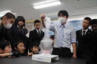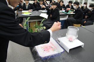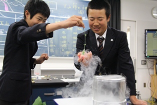 3年生が行った実験道具の残りを使って、2年生が液体窒素でものを凍らす実験を行いました。液体窒素を触ったり、花を凍らせてばらばらにしたり、自然界では見ることができないエタノールが凍ったりしたのを見ました。