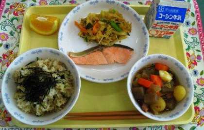 新じゃがは春先から出回るじゃが芋で、皮が薄いので皮ごと食べられることや、水分が多く、ホクホクというよりしっとりした食感、などの特徴があります。じゃが芋にはビタミンCが多く含まれますが、今の時期のじゃが芋にはより多くのビタミンCが含まれているそうです。今日は、豚肉や野菜と一緒に炒め煮にしました。一口サイズの小さな芋が多く、包丁を入れなくてもそのまま食べられました。生徒達も、よく食べていました。