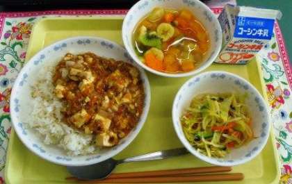 フルーツポンチには、角切りに切った寒天と5種類のフルーツを入れました。フルーツポンチの起源は、東京銀座のフルーツパーラー「千疋屋」にあります。約90年も前に考案されたとのこと。季節によって中身のフルーツをかえて出すことができるので、給食でもメニューに入れやすいです。