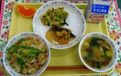 春の味覚の代表である「たけのこ」を使って、ご飯を炊きました。この時期のたけのこは、サクサクして柔らかいです。食物繊維やたんぱく質、ビタミン類なども含まれ、栄養豊富な食材なので、給食以外でもいろいろな料理に使って食べて欲しいと思います。
