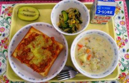 チリチーズトースト わかめサラダ あさりのチャウダー ゴールデンキウイ 牛乳