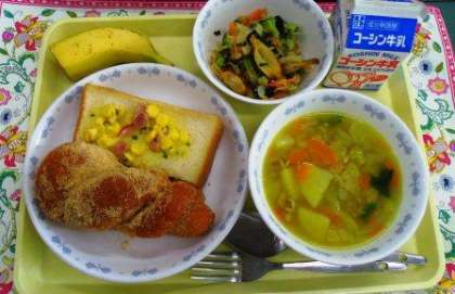 今日の給食 5月25日 公開日 2016/05/25 更新日 2016/05/25 お知らせ きなこ揚げパン マヨコーントースト ごぼうチップサラダ ビーンズスープ バナナ・牛乳 今日は、2種類の味のパンにしました。生徒達もよく食べていました。 いいね(0)
