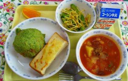 サラダに使用したアスパラは、今が旬の野菜です。揚げたポテトを混ぜて、食べやすくしました。運動会の予行練習で忙しかったですが、生徒たちは給食を良く食べていました。