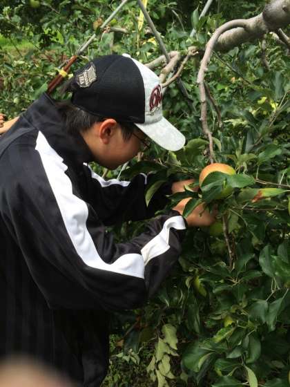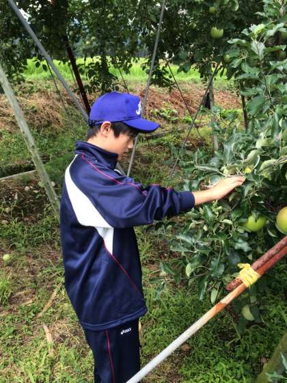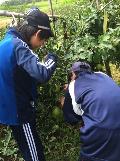 りんごの葉摘をしています。陽にあてることで色付きが良くなるそうです。