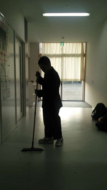 保健室前の廊下掃除の生徒は、T字棒きのプロです。隅から隅まできちんと掃くことができます。