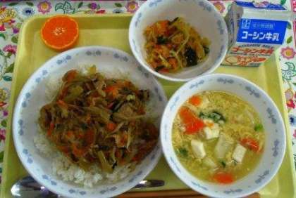 プルコギは、甘口の下味をつけた肉を野菜や春雨と炒め煮する料理で、日本のすき焼きに似ています。今日は丼ぶりにして、ごはんの上にのせました。タレにはすりおろしたリンゴも加え、さわやかな甘みもプラスしました。トックは韓国のお餅です。うるち米からできているので、日本のお餅のようにのびることはなく、炒め物にも使えます。給食では、薄切りにしたトックを卵スープに入れました。今日は食べやすいメニューだったので、残食も少なかったです。