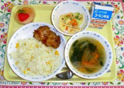 今日は、2学期最後の給食です。最終日は、生徒達が食べやすいメニューにしました。デザートは、牛乳寒天にイチゴソースをかけて、イチゴとキウイフルーツをトッピングしました。教室を巡回していたら、チキンのおかわりに人が集まり、元気な声でじゃんけんをしている姿が…。今日は全体的に残食が少なかったです。冬休みも、三食しっかり食べ、元気に過ごして欲しいです。