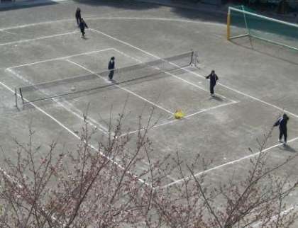 写真は、咲き始めた桜の花の下で、活動するソフトテニス部の生徒です。(4月2日、午後1時撮影)
