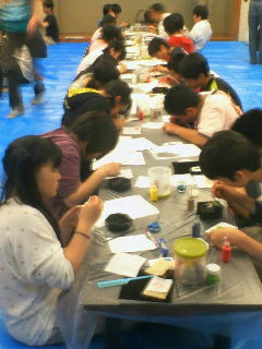 ただ今、漆器の絵付け体験中です。1.2組の生徒達は、事前に描いた下絵を真剣に写し取っています。