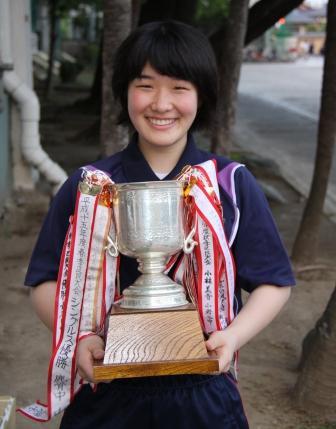 写真は、バドミントンの春季区民大会シングルで優勝した3年生のIさんと優勝トロフィーです。佐々木コーチが向けるカメラに、ちょっと照れながら、嬉しそうに笑っている笑顔かとても爽やかです。