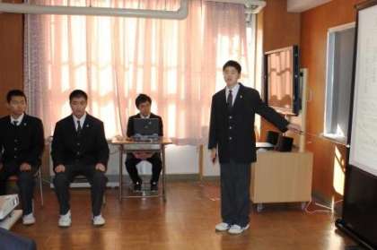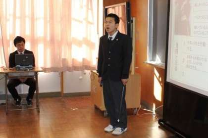 後期の2週間の職場実習が終わり、A君とK君は、下級生の前で実習の成果を報告しました。