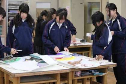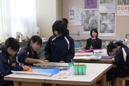 美術室では、30人ほどの生徒が、環境ポスターを完成させようと、作業に励みました。友達どうしで作品を見せ合っている様子や、一生懸命に作業している様子が見られました。