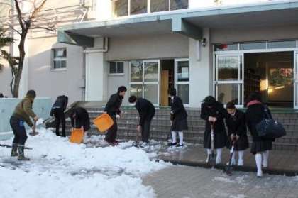 宮本副校長先生は、生徒が滑ってけがをしないように、6時過ぎのまだ暗いうちから校門付近の雪かきをしてくれました。朝早い5組の田村、安田、前田の各先生、三浦用務主事、森山用務主事、生徒会の市川先生、養護の加藤先生、1年の増田先生、加藤先生、2年の吉田先生も歩道などの雪かきをしてくれました。ご苦労さまでした。その他に、卓球部の生徒と宮地先生で、校舎北側の通路をきれいに