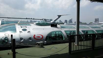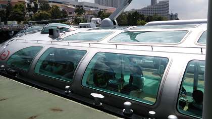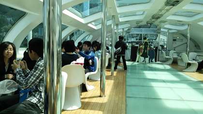 海上バスに、乗りました〓未来のイメージの海上バスで、おやつタイム。まわりの景色も、とてもきれいですよ(^o^)
